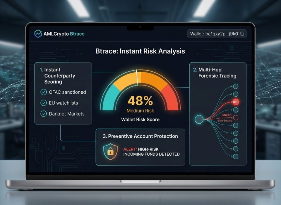 Ensure full regulatory compliance with our automated KYT (Know Your Transaction) engine. Btrace provides instant, 0-100% risk scoring for wallets and transactions, allowing businesses and individuals to detect links to sanctions, darknet markets, and mixers before they cause account freezes.